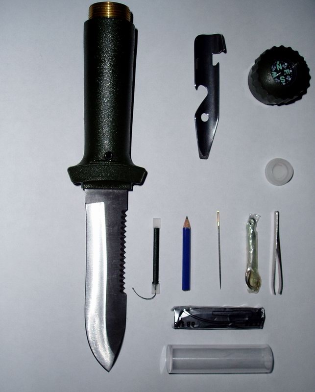 Полость рукояти герметичная, в ней находиться капсула с минимальным "набором выживания".